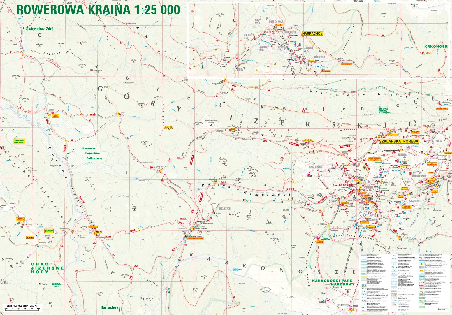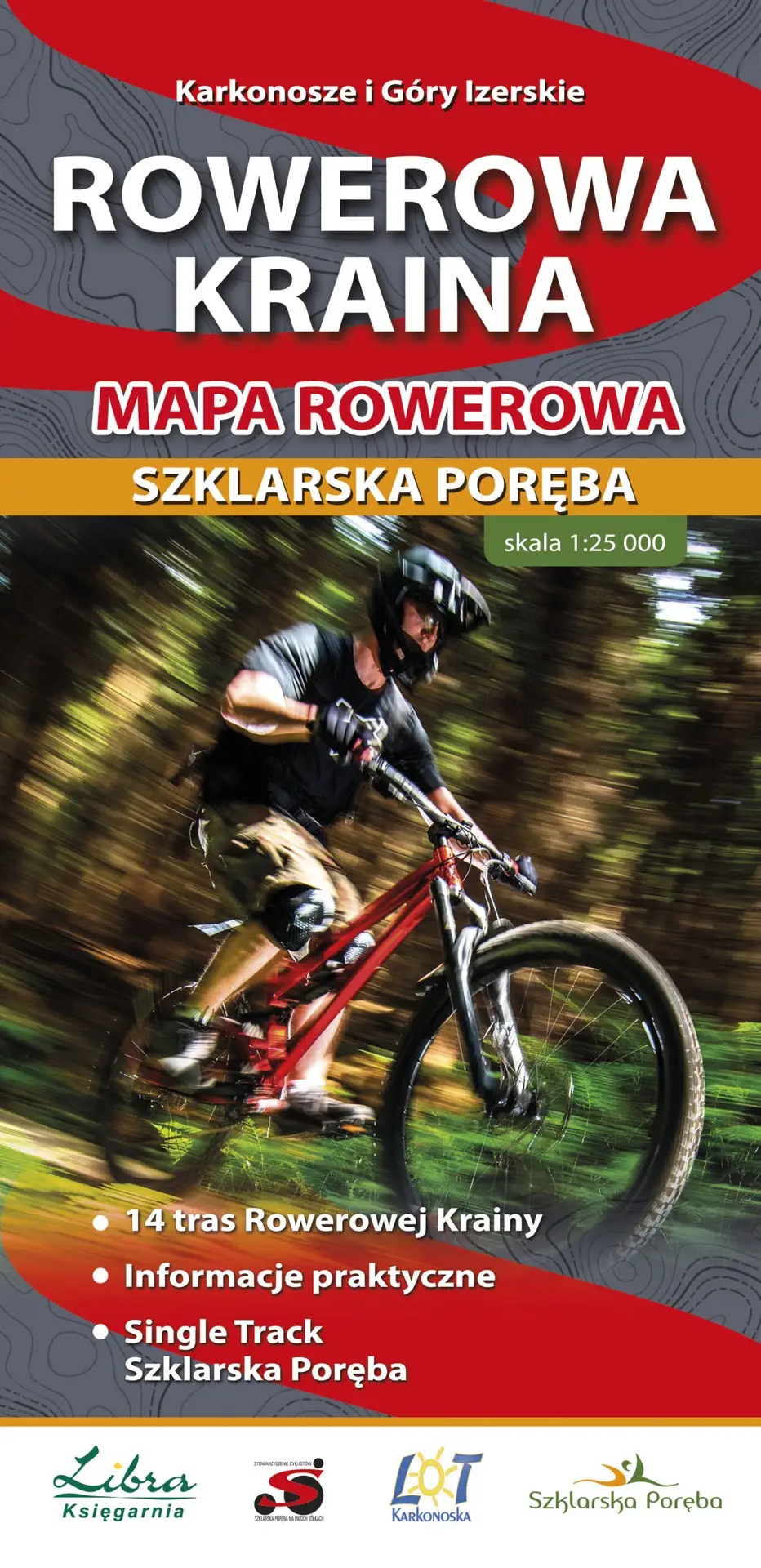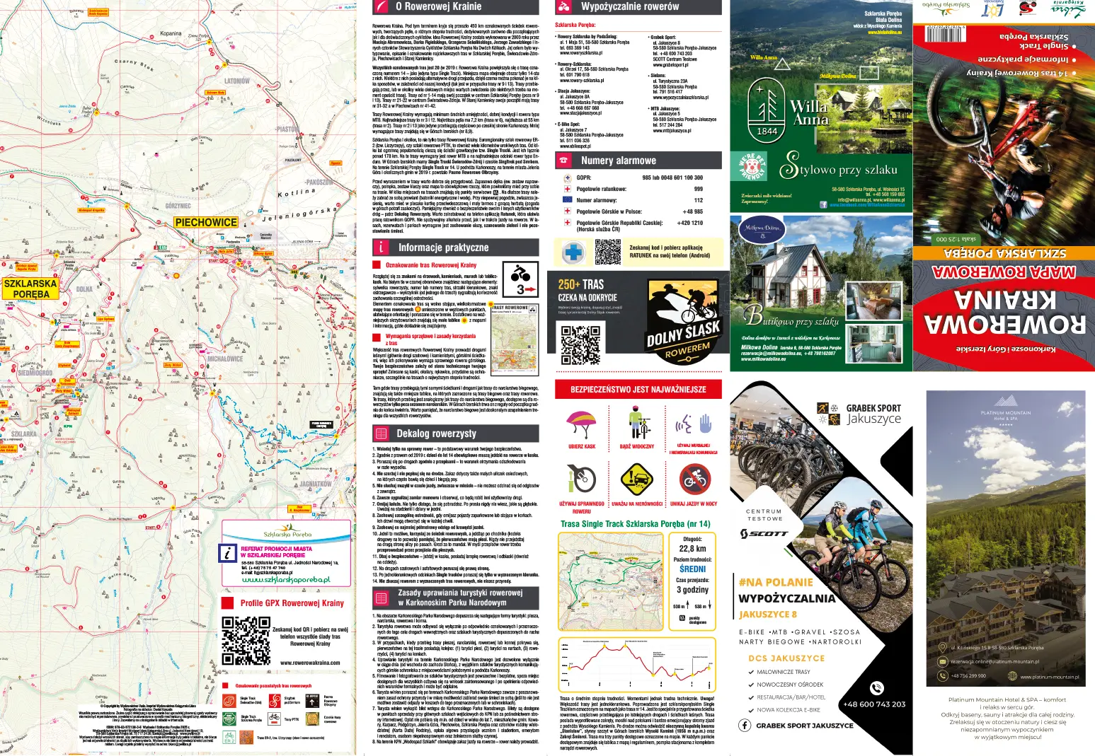 W środku: opis Rowerowej Krainy, informacje praktyczne, dekalog rowerzysty, spis wypożyczalni rowerów, opis trasy Single Track Szklarska nr 14